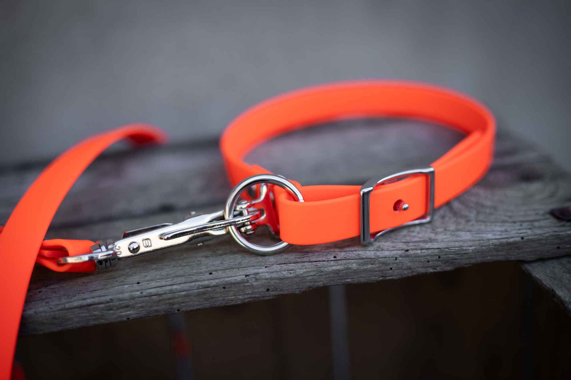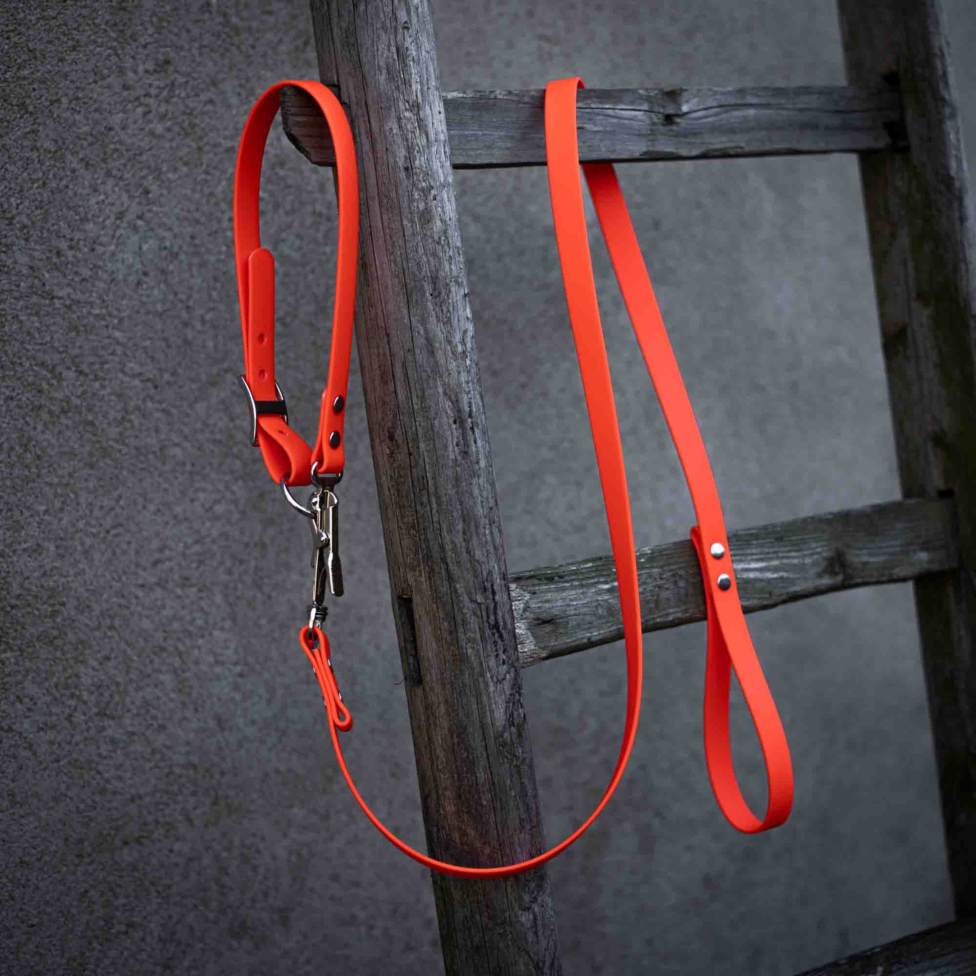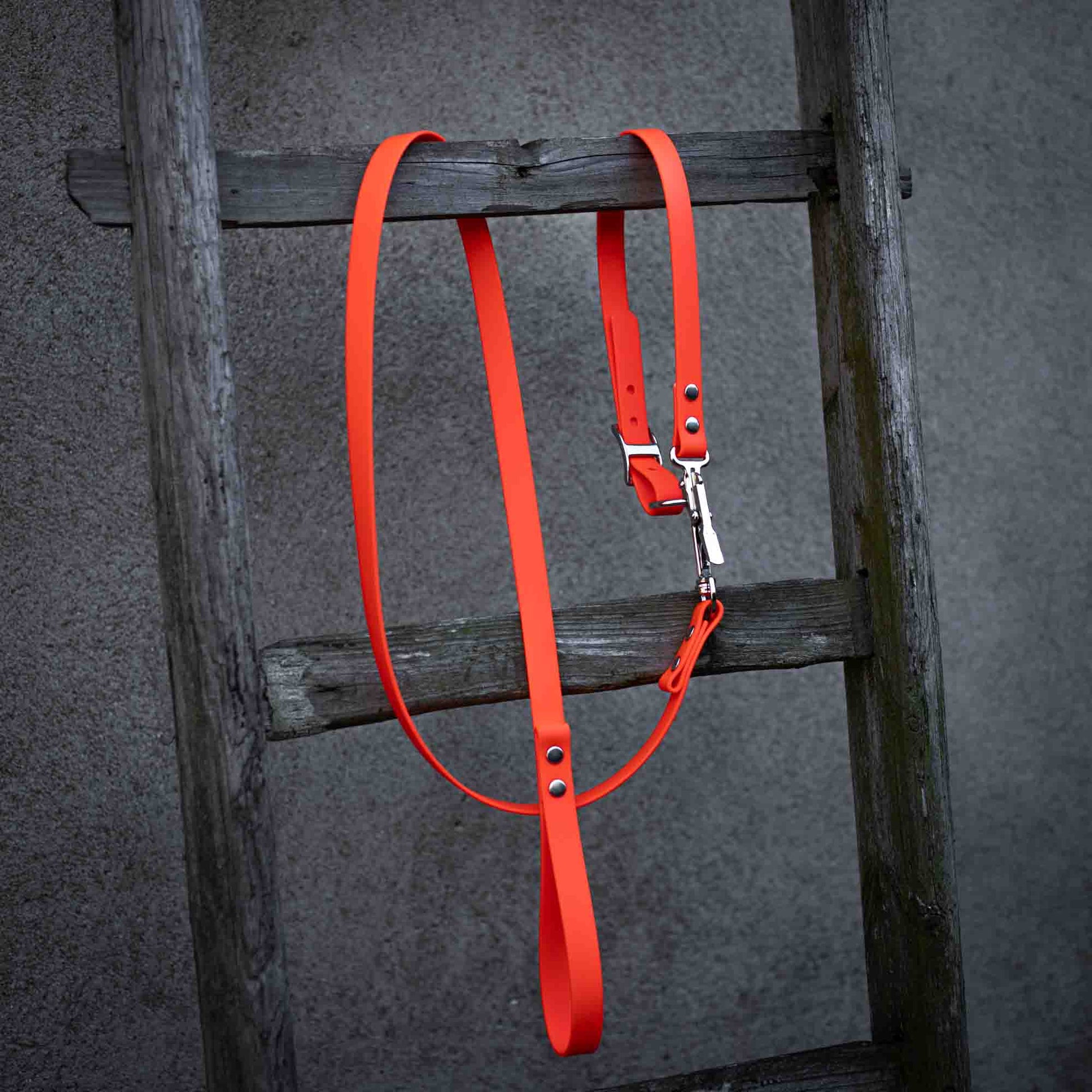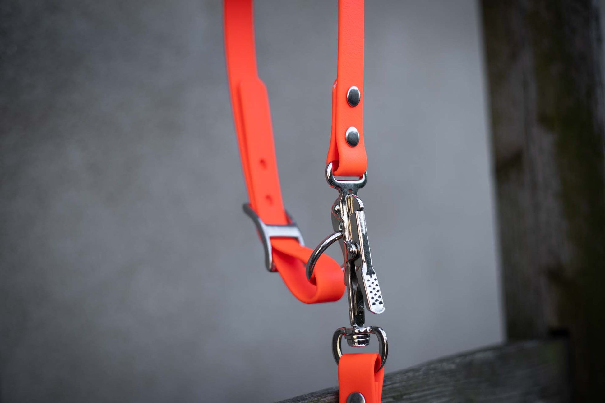 Die Halsung ist mittels Conwayschnalle in der Größe verstellbar und einem HS Sprenger Jagdhaken mit der Leine mit Griff verbunden. Leichter Druck auf den Jagdhaken - und schon kann der Hund rennen.